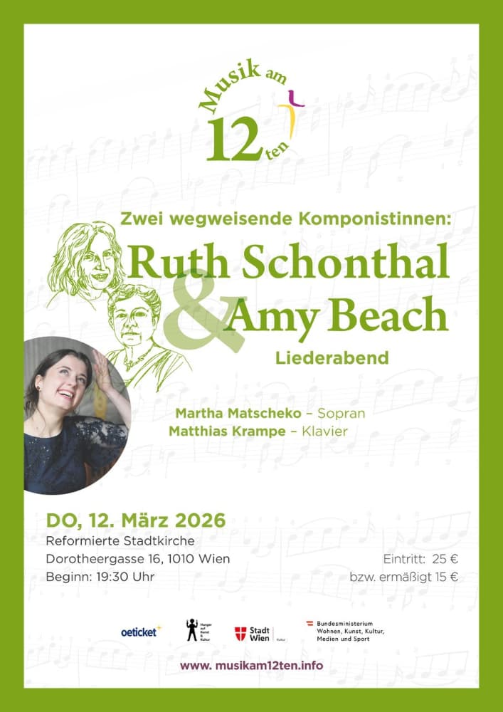 M12 im März: Liederabend Amy Beach (1867 – 1944) & Ruth Schonthal (1924 – 2006) Reformierte Stadtkirche, Dorotheergasse 16 Donnerstag 12.03.2026 um 19:30 Uhr Ruth Schonthal, höchst bemerkenswerte Komponistin mit Wiener Wurzeln, teilt mit so vielen großartigen Musiker*innen des 20.Jh. ein Emigrantenschicksal, sie steht darüber hinaus aber auch als Frau bis heute im Schatten männlicher […] |